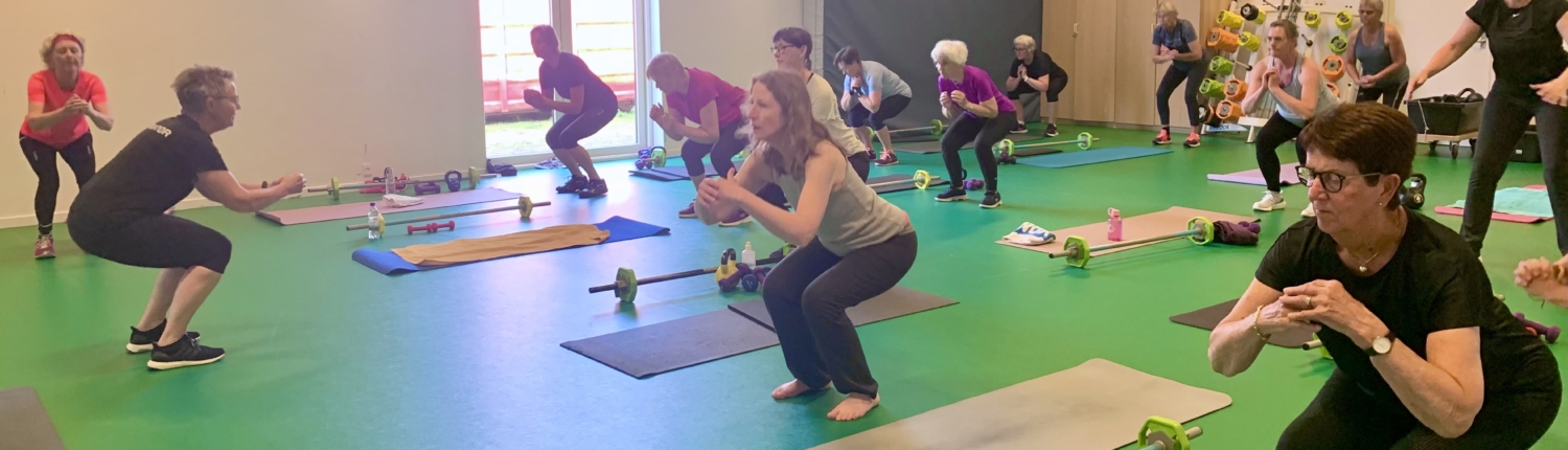 Vi træner ben, arme, mave og ryg i forskellige øvelser stående og liggende på måtte.